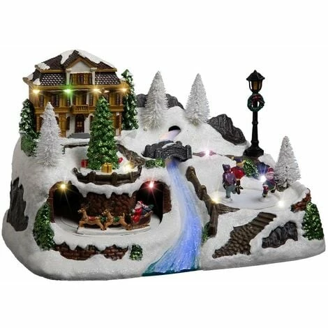- Doté de 11 LED lumineuses, ce village de Noël animé représente un paysage enneigé surmonté d’un hôtel de montagne, avec une jolie riviere qui coule en contrebas.